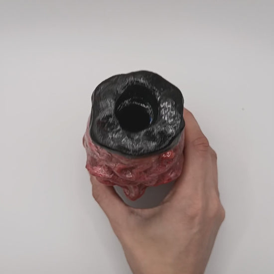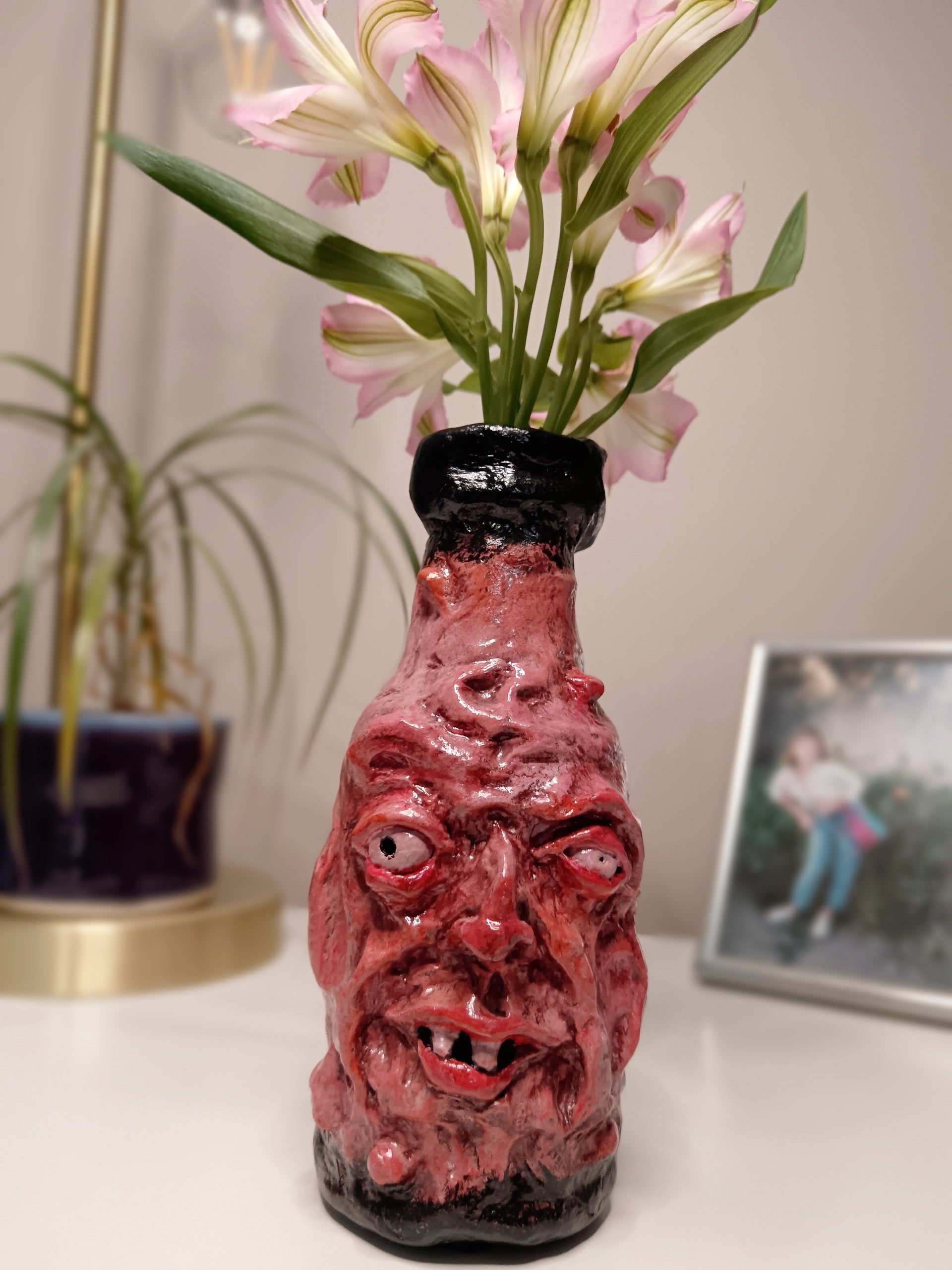 This quirky decorative vase is hand sculpted with high quality modelling clay around glass so it can be used for fresh/dry flowers or be admired as a stand alone ornamental oddity. It's hand painted with acrylics and finished with a clear lacquer for durability.